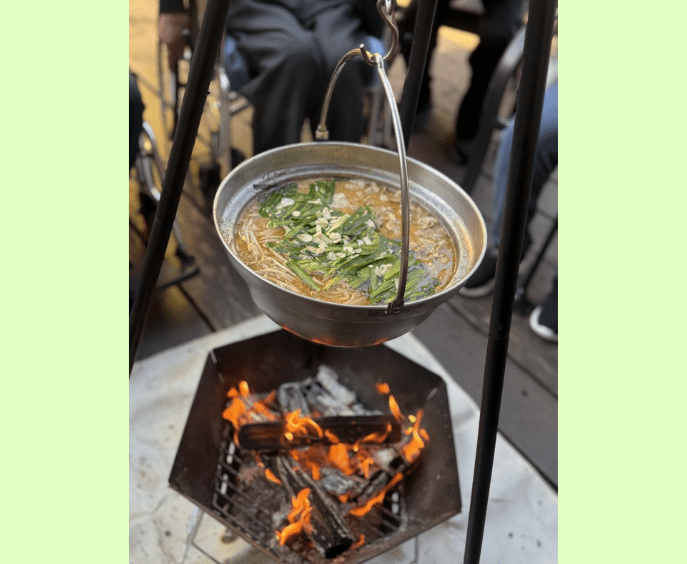 生の火を囲んで食べるもつ鍋とお酒は最高!!