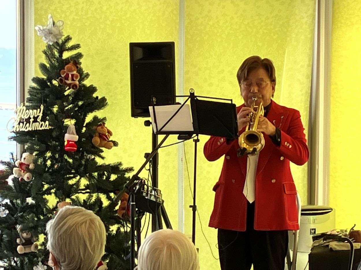 サンタさんのような真っ赤なスーツでクリスマスソングを演奏してくださいました♬