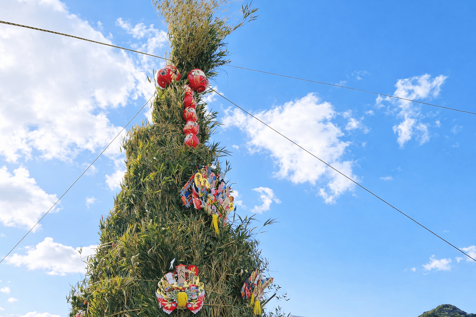 前々日には朝から町内の方々が集まり、竹を組み上げて正月飾りやお札、