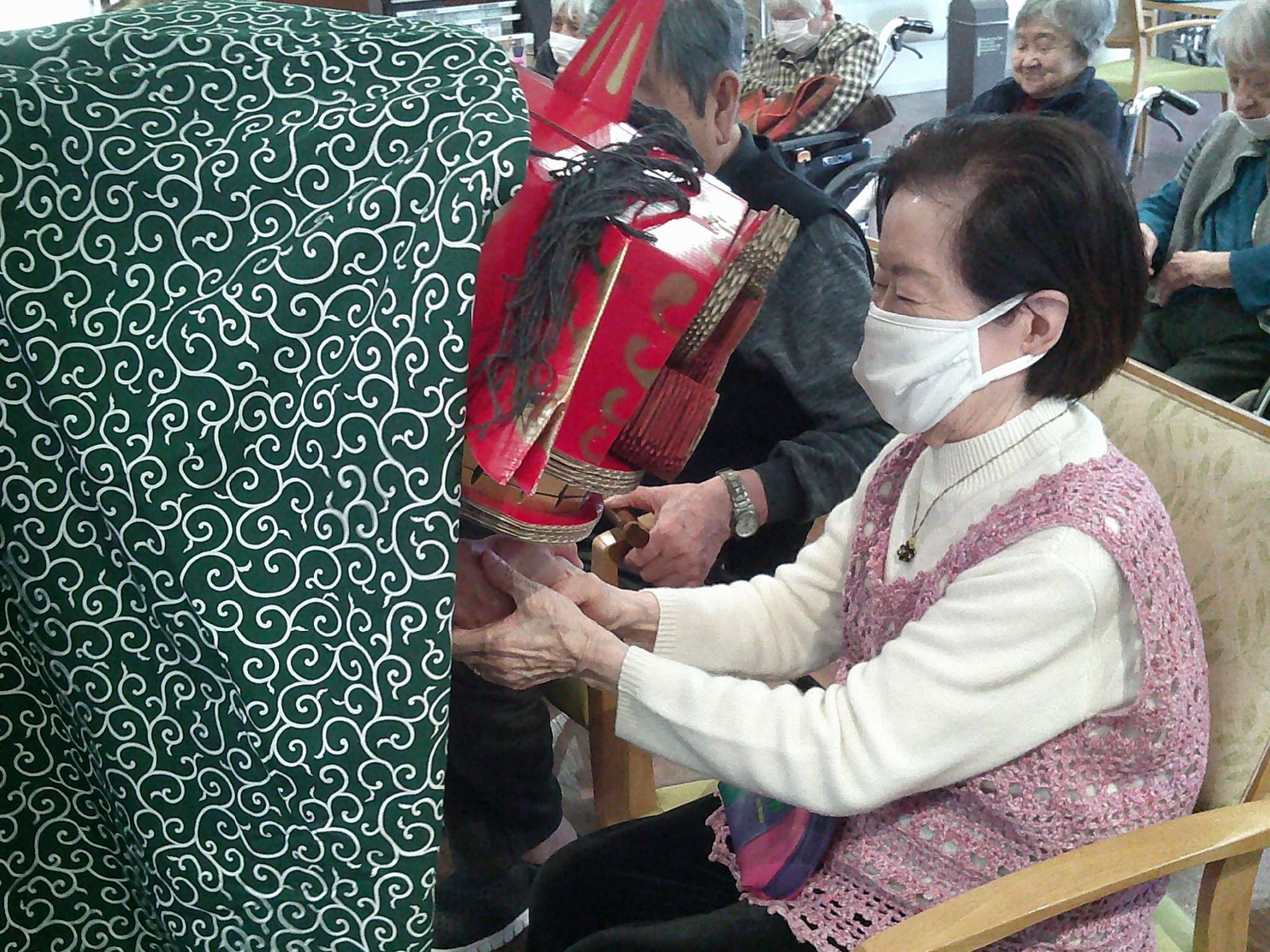 あらあら・・・獅子舞とにらめっこ そして・・・口から手が出て握手???
