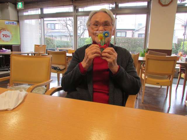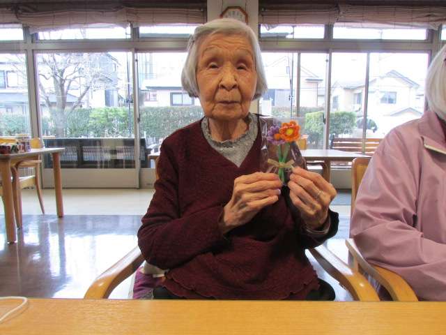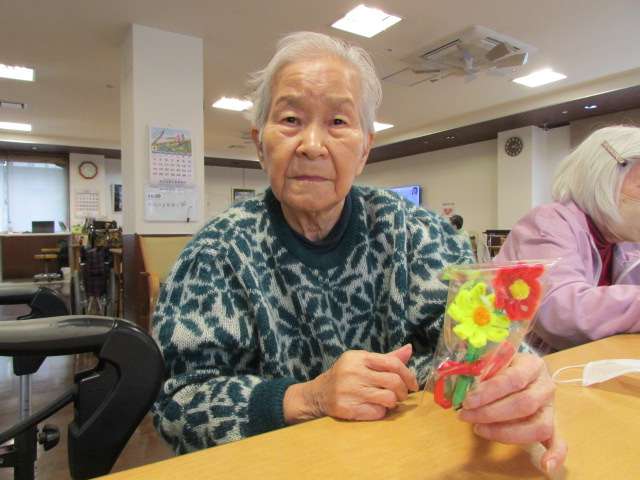 レクリエーションの一環として、今回は入居者様にモールでお花を作っていただきました(^_-)-☆