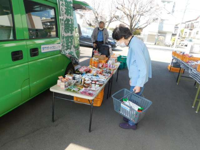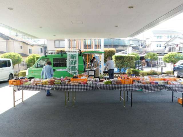 「新鮮野菜」ののぼりも出していただき、音楽が流れる中で入居者様に購入をしていただきます😉