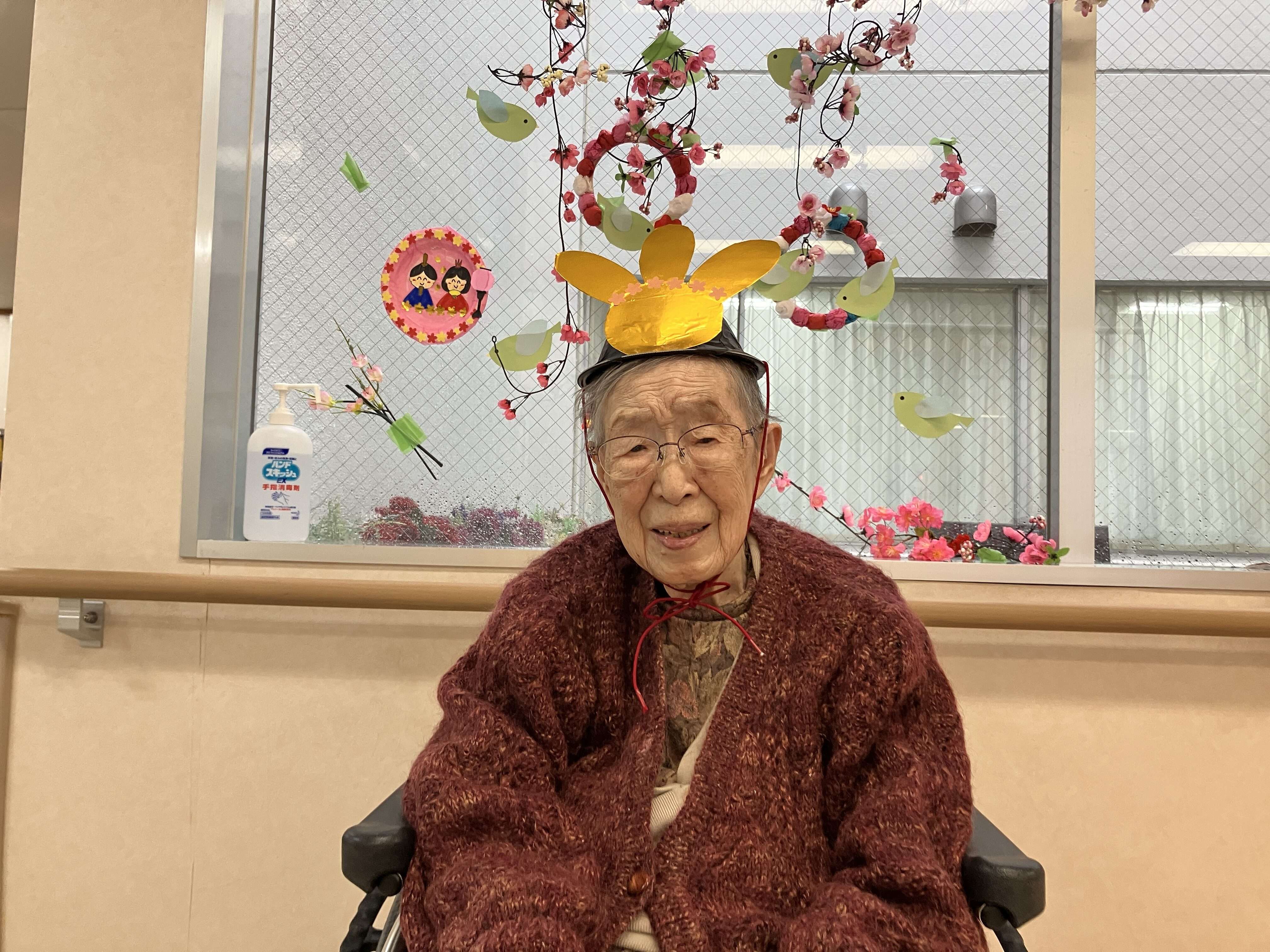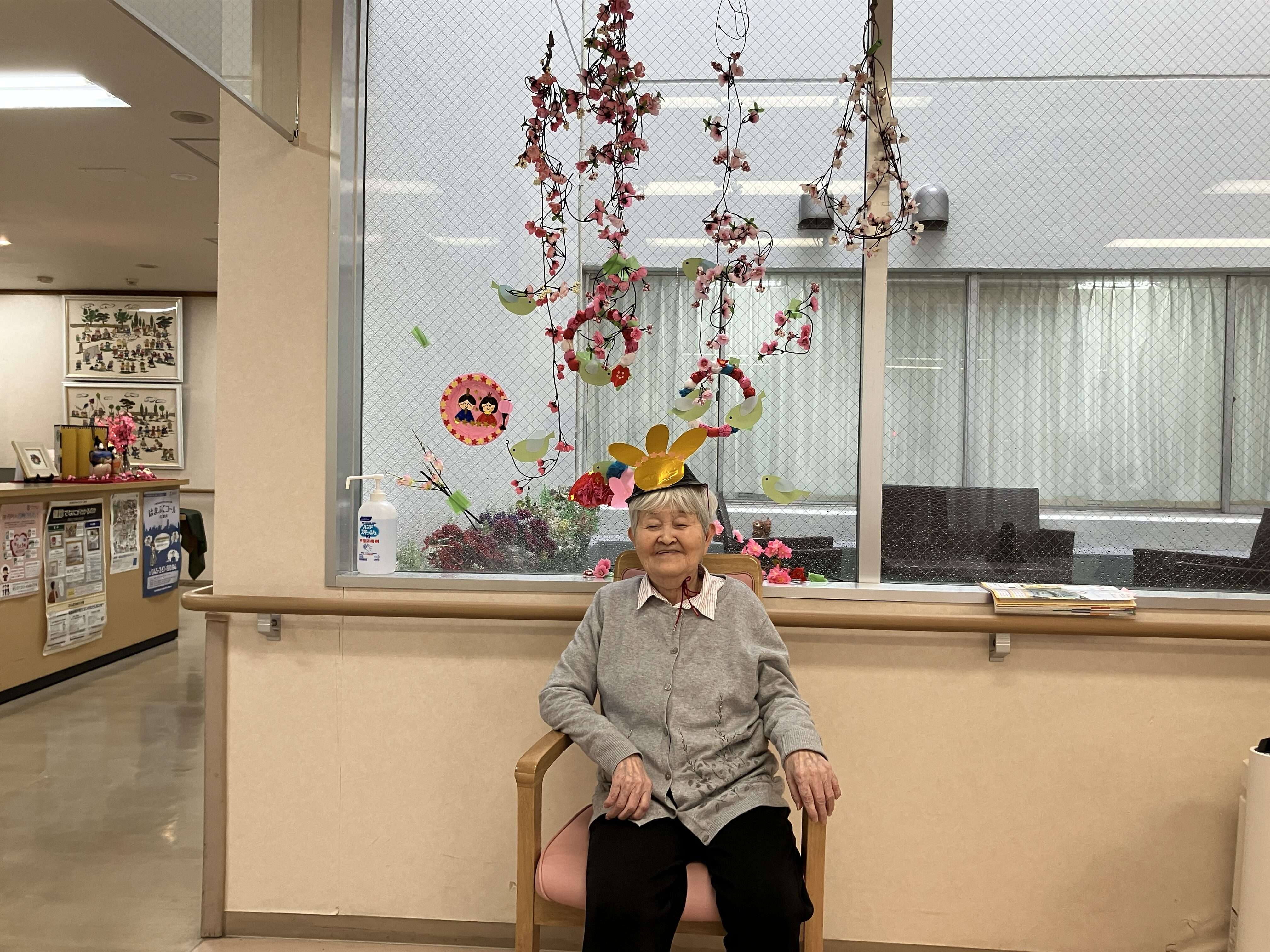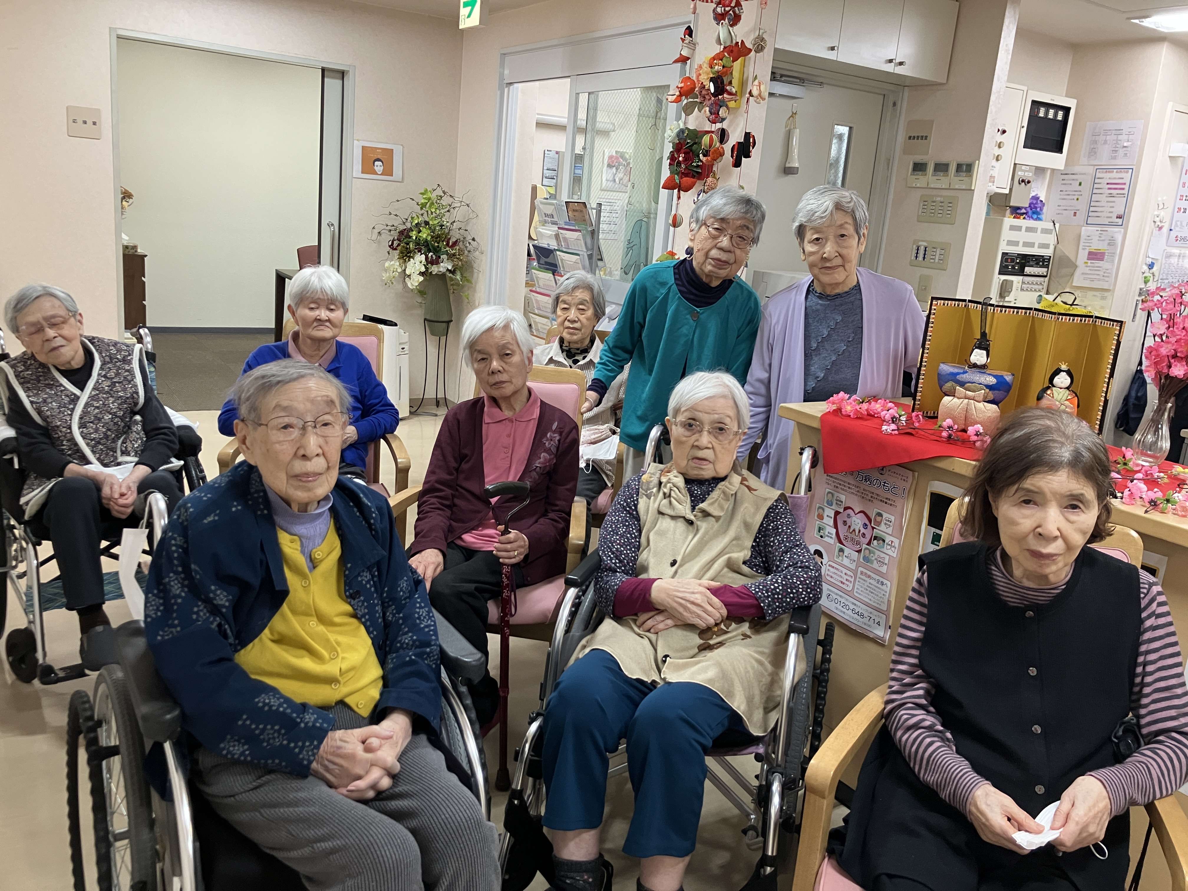 女性ご入居者様でお雛様と吊るし雛をバックに記念撮影。
